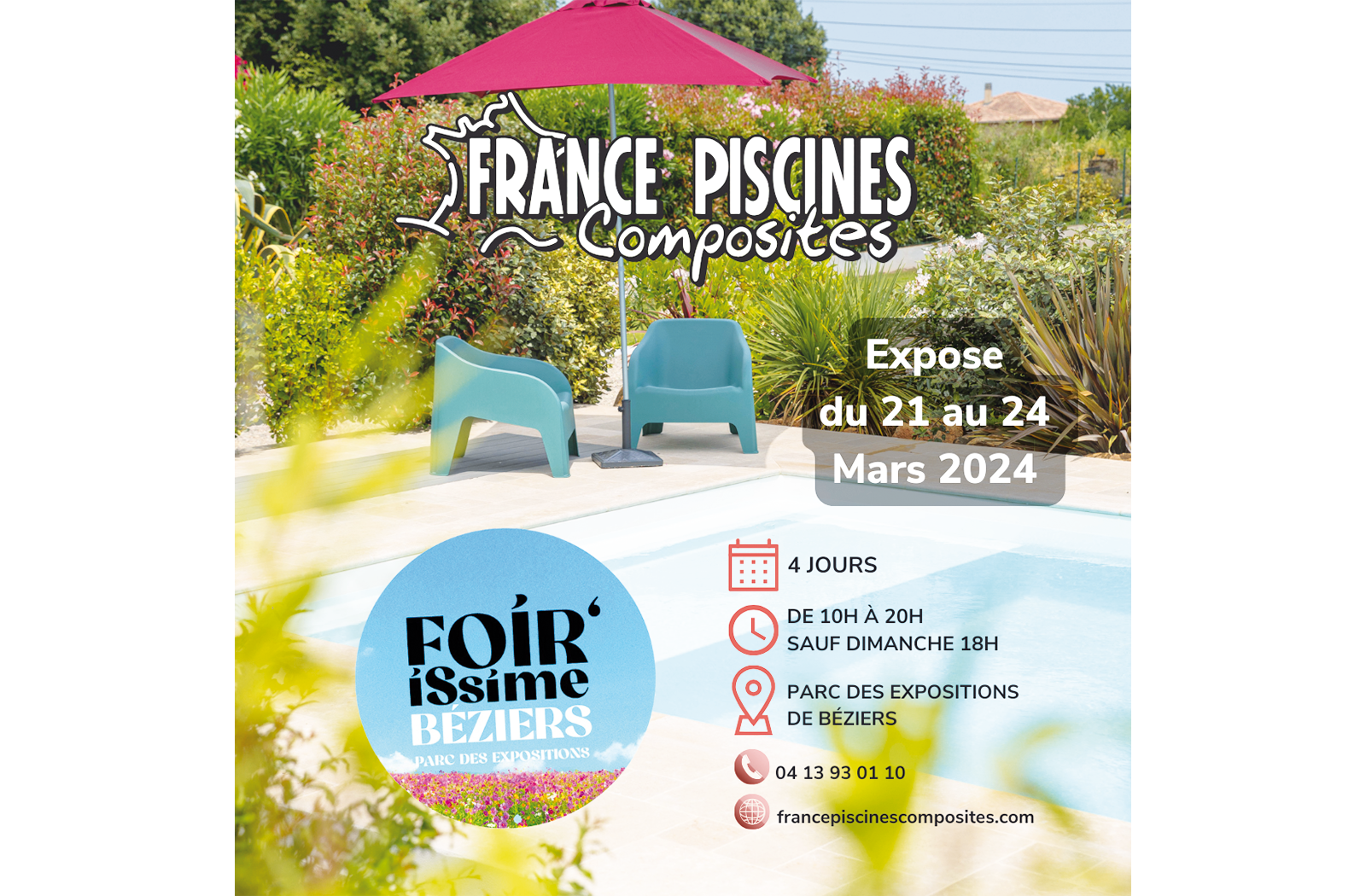 La 39ème Foire de Béziers débutera à partir du jeudi 21 jusqu'au dimanche 24 mars 2024 et nous sommes heureux de vous annoncer que la société FRANCE PISCINES COMPOSITES sera présente !