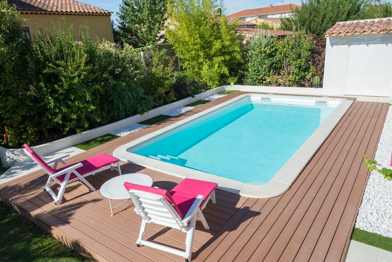 Voici la réalisation d'une piscine polyester pour un client. Cette piscine est le modèle Açores, il est rectangulaire à fond plat et se veut à la fois moderne et contemporain.