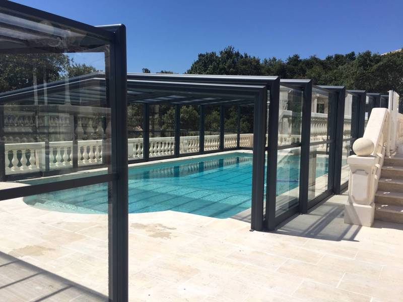 France Piscines Composites vous propose via son partenaire SOKOOL : un abri de piscine 3 angles télescopique Haut CASSIOPÉE et adaptable à la quasi totalité de nos piscines.
