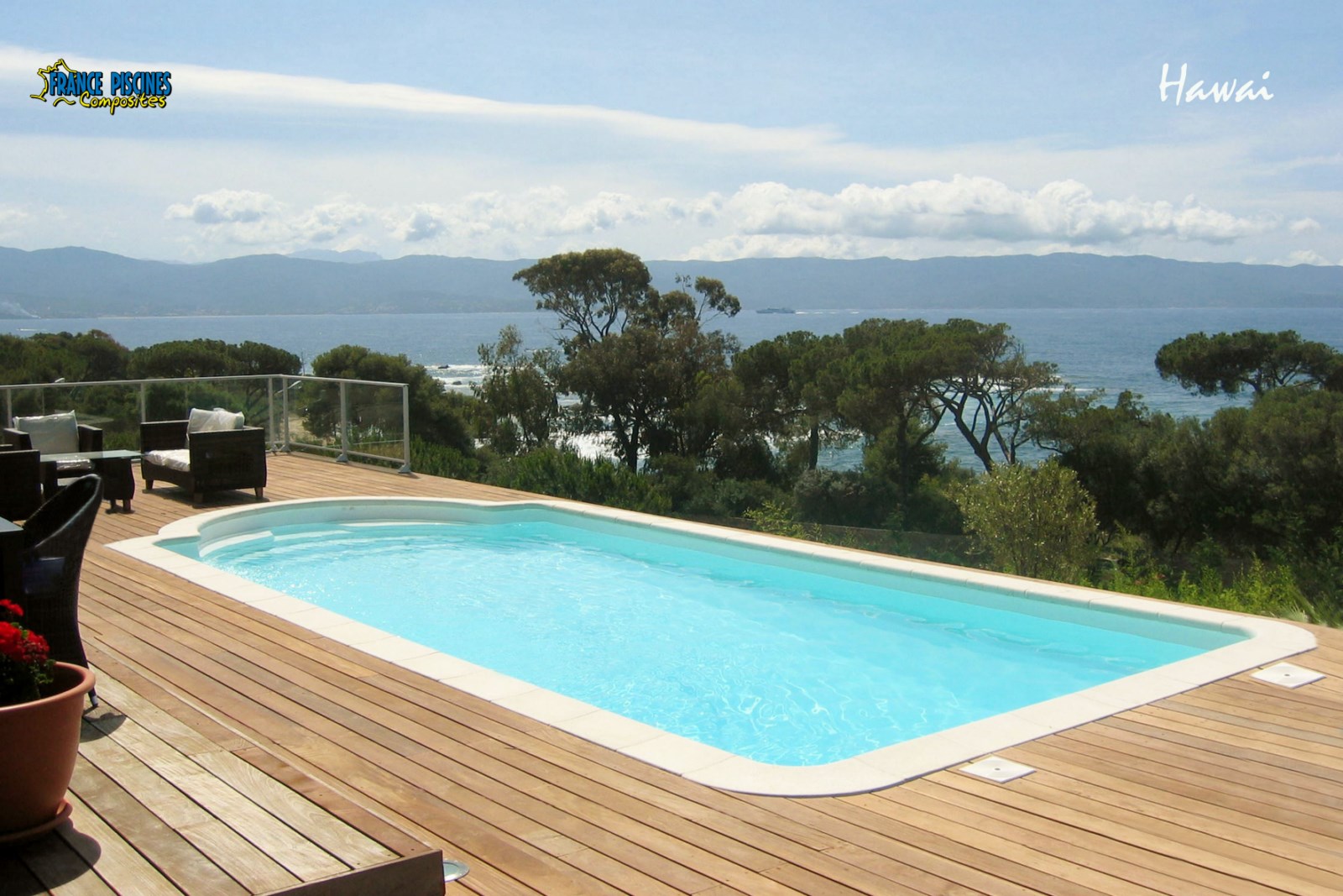 Ici, installation d'une piscine coque polyester modèle Hawai en Corse du Sud. Piscine avec escalier roman et banquette, plage en bois sur mesure avec vu sur la mer. C'est Notre concessionnaire d'Ajaccio qui s'est occupé de ce projet.